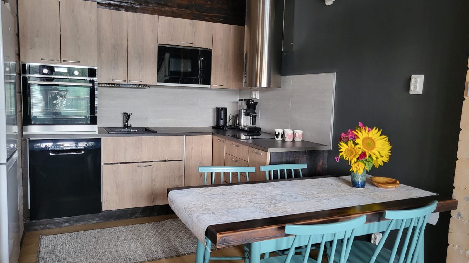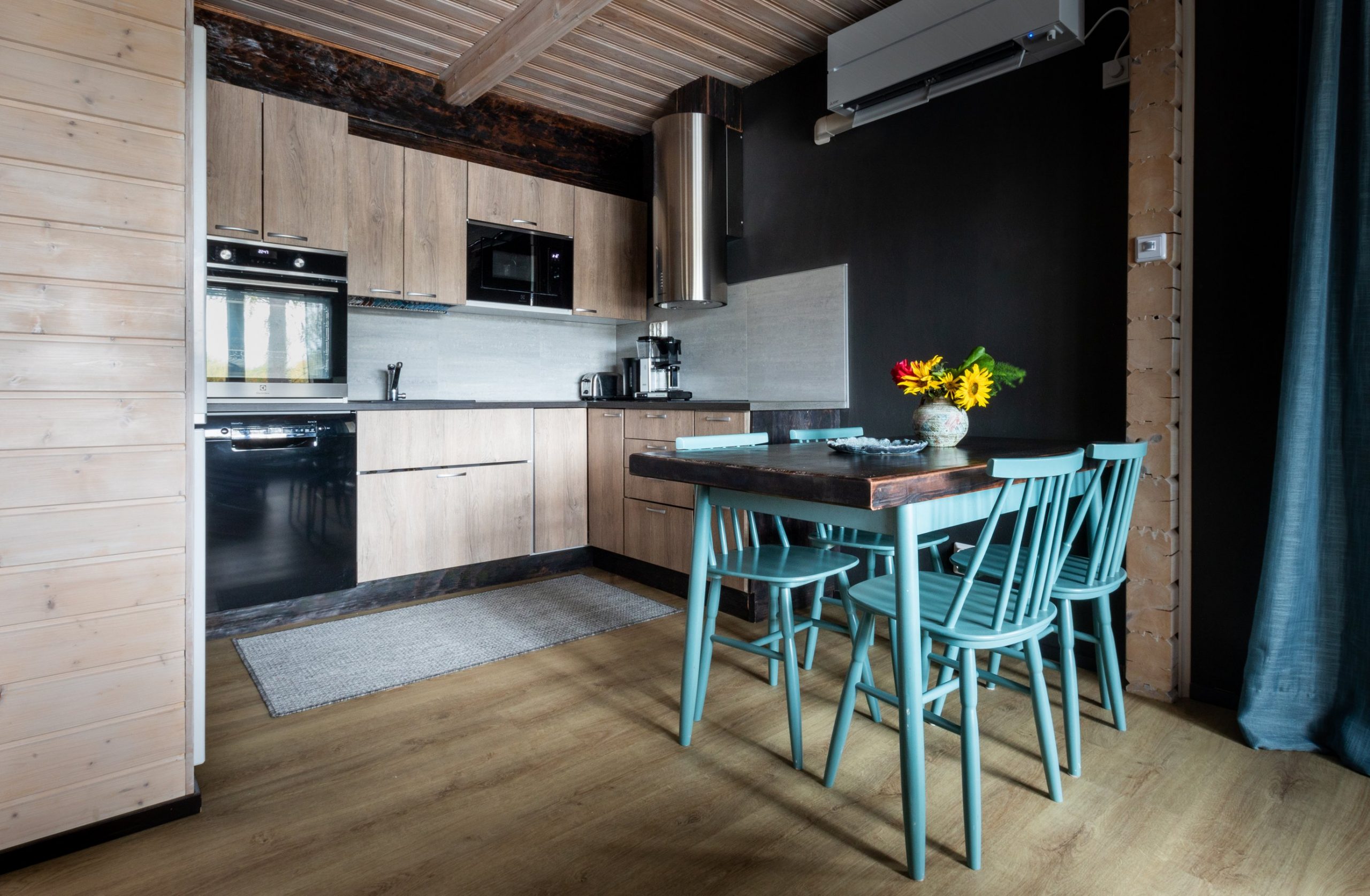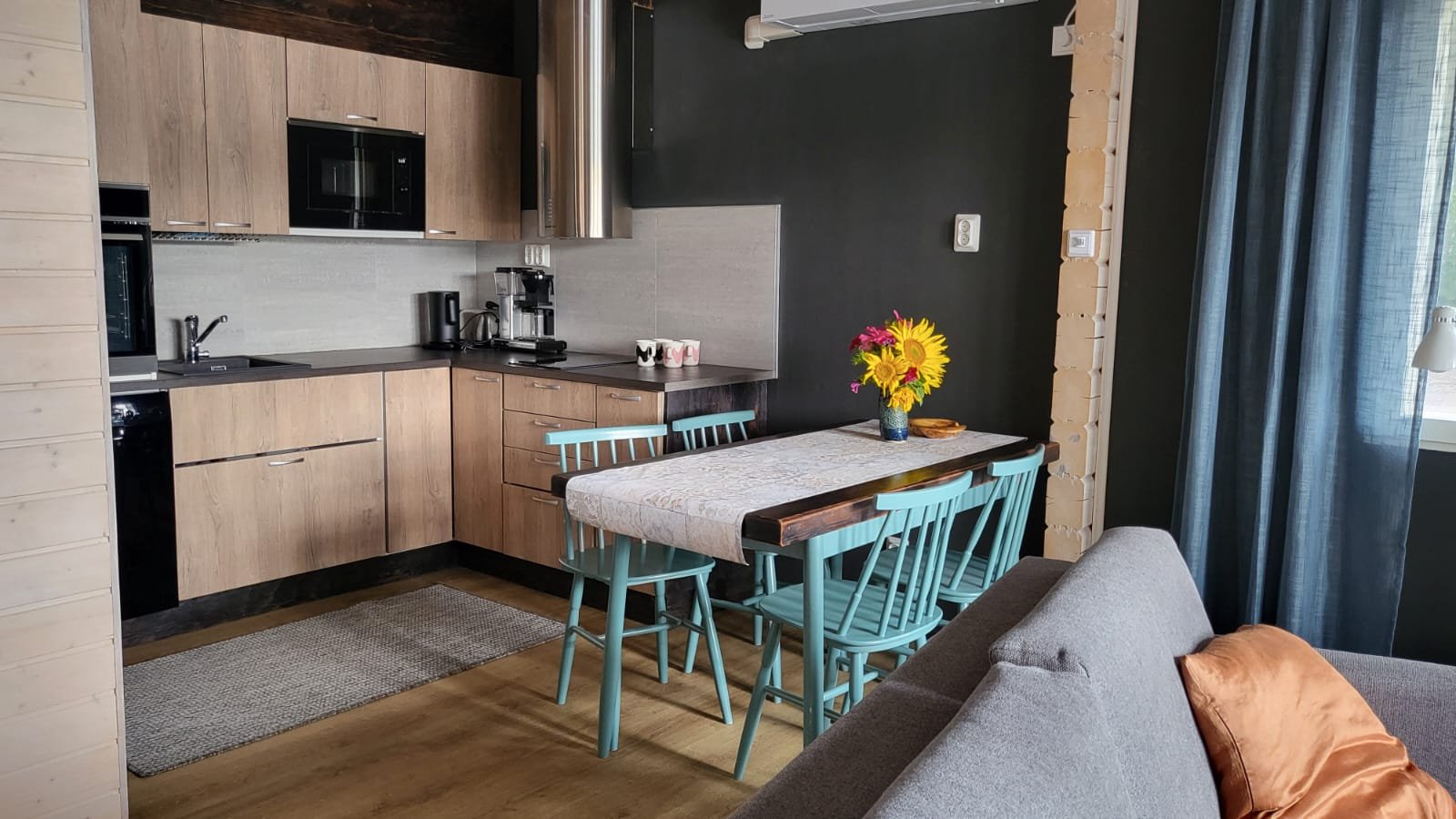 In cottage Tiira you’ll find the most essential kitchen features; fridge with freezer, microwave, stove, oven, electric kettle and coffee maker. There is also free wifi and smart TV in the cottage.